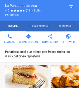 Ejemplo de un Perfil comercial de una panadería, donde se destaca la función Opiniones.